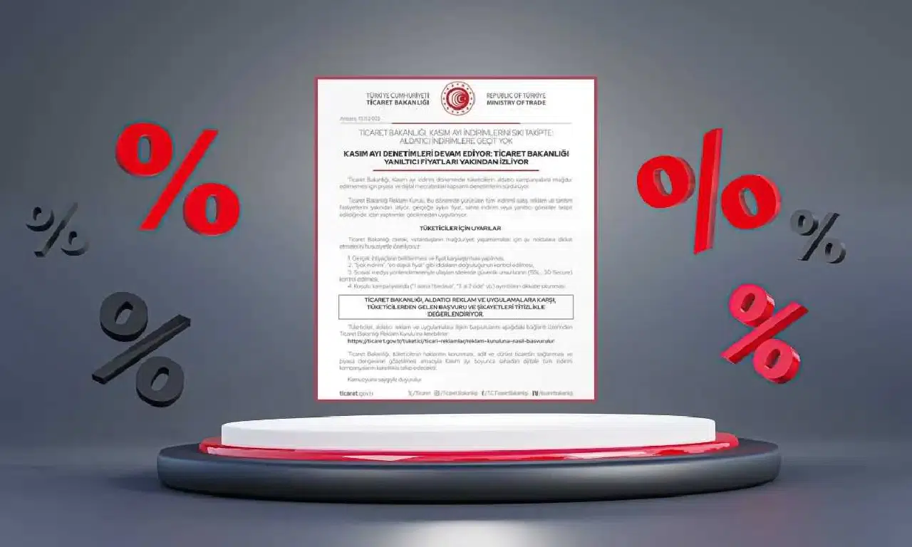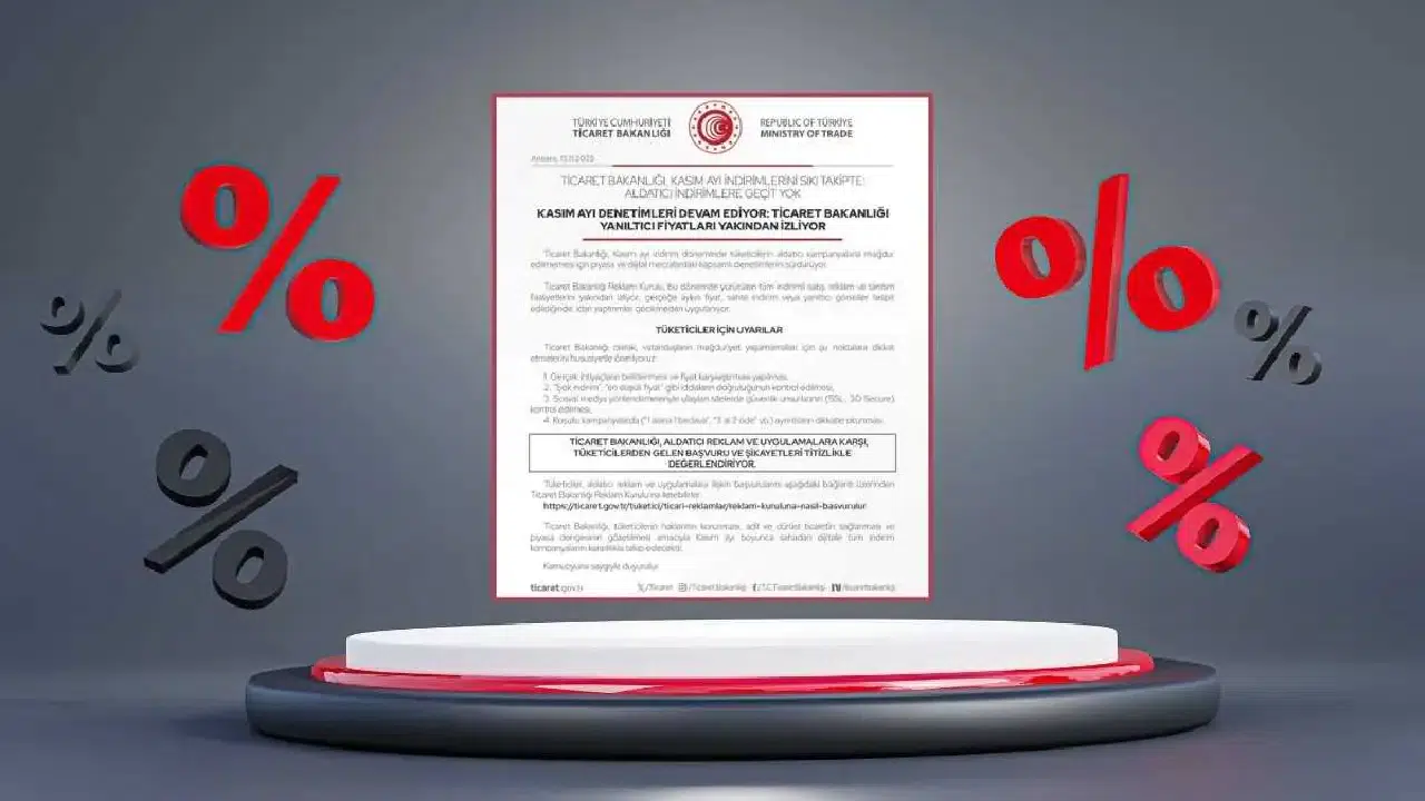 “Ticaret Bakanlığı, Kasım ayı indirim döneminde tüketicilerin aldatıcı kampanyalarla mağdur edilmemesi için piyasa ve dijital mecralardaki kapsamlı denetimlerini sürdürüyor. Ticaret Bakanlığı Reklam Kurulu, bu dönemde yürütülen tüm indirimli satış, reklam ve tanıtım faaliyetlerini yakından izliyor; gerçeğe aykırı fiyat, sahte indirim veya yanıltıcı görseller tespit edildiğinde, idari yaptırımlar gecikmeden uygulanıyor."