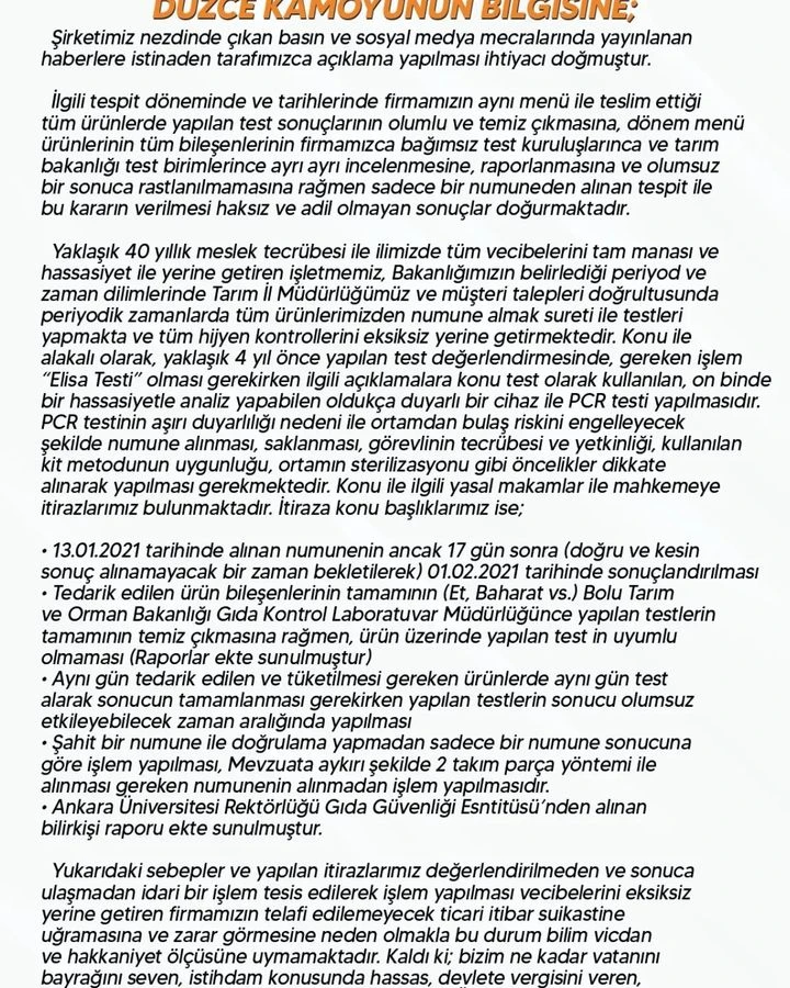 "Şirketimizin yaptığı tüm testler olumlu çıkmış olmasına rağmen, sadece bir numuneden alınan sonuçla karar verilmesi adil değildir. Testlerin duyarlı cihazlarla yapılması gerekirken yanlış yöntemlerle yapılması firmamızın itibarını zedelemektedir."