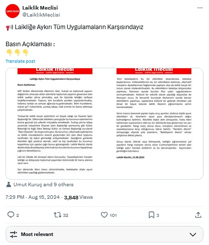 Laiklik Meclisi, yazılı bir açıklama yaparak, AKP iktidarı döneminde laiklik ilkesinin zayıflatıldığını ve bu durumun toplumsal yapıya zarar verdiğini ifade etti. Açıklamada, laikliğin ülkenin idari, hukuki ve toplumsal yapısını koruyan temel bir ilke olduğuna dikkat çekildi.