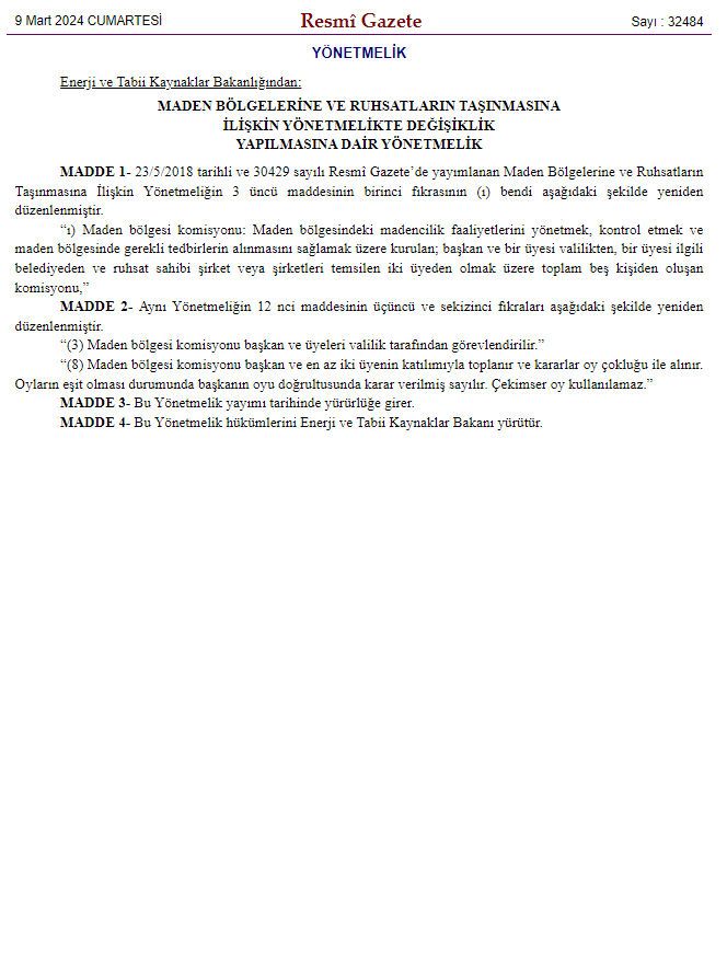 Enerji ve Tabii Kaynaklar Bakanlığı tarafından hazırlanan "Maden Bölgelerine ve Ruhsatların Taşınmasına İlişkin Yönetmelikte Değişiklik Yapılmasına İlişkin Yönetmelik", Resmi Gazete'de yayımlanarak yürürlüğe girdi. Bu yeni düzenlemelerle ilgili detaylar kamuoyuyla paylaşıldı.