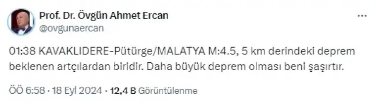 Jeoloji Yüksek Mühendisi Prof. Dr. Ahmet Ercan, deprem sonrası yaptığı açıklamada, Malatya'daki depremin beklenen bir artçı sarsıntı olduğunu vurgulayarak, "Daha büyük bir depremin olması beni şaşırtır" ifadelerini kullandı.