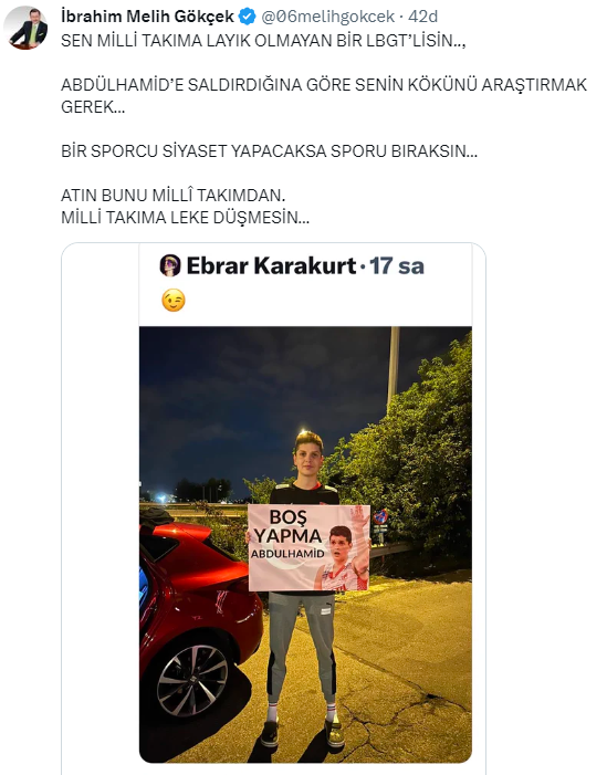 Melih Gökçek, milli voleybolcu Ebrar Karakurt'u sosyal medya hesabı üzerinden "Sen milli takıma layık olmayan bir LGBT'lisin. Abdülhamid'e saldırdığına göre senin kökünü araştırmak gerek. Bir sporcu siyaset yapacaksa sporu bıraksın. Atın bunu milli takımdan. Milli takıma leke düşmesin." sözleriyle hedef gösterdi.