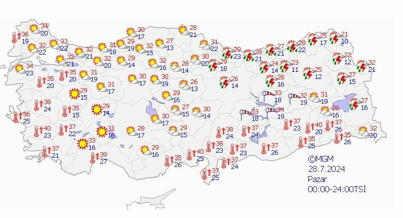 - Trabzon: 27°C, Parçalı ve çok bulutlu, aralıklı sağanak ve gök gürültülü sağanak yağışlı, öğle saatlerinde yerel kuvvetli yağış bekleniyor