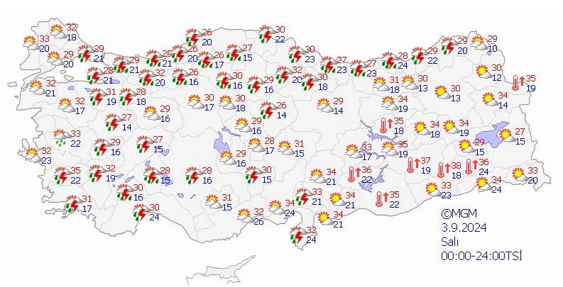 Kuvvetli Yağış Uyarısı: Batı Akdeniz’in iç kesimleri, Doğu Akdeniz’in Toroslar mevkii, Hatay, Afyonkarahisar, Sakarya çevreleri, Muğla, Ordu, Giresun, Rize ve Trabzon'un iç kesimlerinde yerel kuvvetli yağışlar bekleniyor. Bu nedenle ani sel, su baskını, yıldırım, yerel dolu yağışı ve kuvvetli rüzgar gibi olumsuzluklara karşı dikkatli ve tedbirli olunması gerekmektedir.