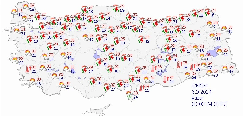 Parçalı ve az bulutlu, kuzey ve batısının yer yer çok bulutlu, öğleden sonra ve akşam saatlerinde kuzey ve batı kesimlerinde yerel sağanak ve gök gürültülü sağanak yağışlar görülecek.
