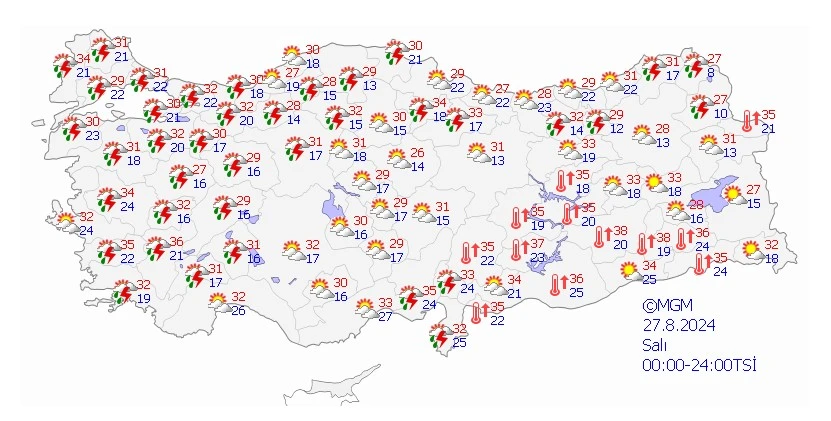 Meteoroloji Genel Müdürlüğü'nün son tahminlerine göre, ülkemizin kuzeyi ile zamanla güney ve batı kesimlerinin parçalı, yer yer çok bulutlu olacağı belirtiliyor. Marmara, İç Ege, Akdeniz'in iç kesimleri ve İskenderun Körfezi çevreleri, İç Anadolu'nun kuzeybatı ve güney kesimleri, Karadeniz'in iç kesimleri ile Düzce, Sinop, Samsun, Kars ve Ardahan çevrelerinde yerel sağanak ve gök gürültülü sağanak yağışların görülmesi bekleniyor. Özellikle Kocaeli'nin kuzey kesimleri ile İstanbul'da kuvvetli yağışlar olabileceği uyarısında bulunuluyor.