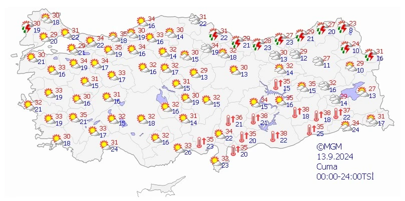 Meteoroloji Genel Müdürlüğü tarafından yapılan son tahminlere göre: Ülkemizin kuzey ve doğu kesimlerinin parçalı yer yer çok bulutlu, Orta ve Doğu Karadeniz kıyıları, Artvin, Kars, Ardahan, Iğdır, Van'ın doğusu, Balıkesir'in batı ilçeleri ve Edirne çevreleri ile Doğu Akdeniz'in Toroslar mevkii ve Kahramanmaraş'ın batısının yerel olmak üzere sağanak ve gök gürültülü sağanak yağışlı, diğer yerleri az bulutlu ve açık geçeceği tahmin ediliyor.
