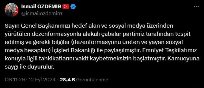 MHP Genel Başkan Yardımcısı İsmail Özdemir, sosyal medya üzerinden yaptığı açıklamada, Devlet Bahçeli'nin sağlığı hakkında yayılan dezenformasyonun kesinlikle doğru olmadığını belirtti. Özdemir, "Sayın Genel Başkanımızı hedef alan ve sosyal medyada yürütülen dezenformasyon çabaları partimiz tarafından tespit edilmiştir. Bu konuda bilgileri (dezenformasyonu üreten ve yayan sosyal medya hesapları) İçişleri Bakanlığı ile paylaşmış bulunuyoruz. Emniyet Teşkilatımız konuyla ilgili tahkikatlarını derhal başlatmıştır. Kamuoyuna saygıyla duyurulur" dedi.