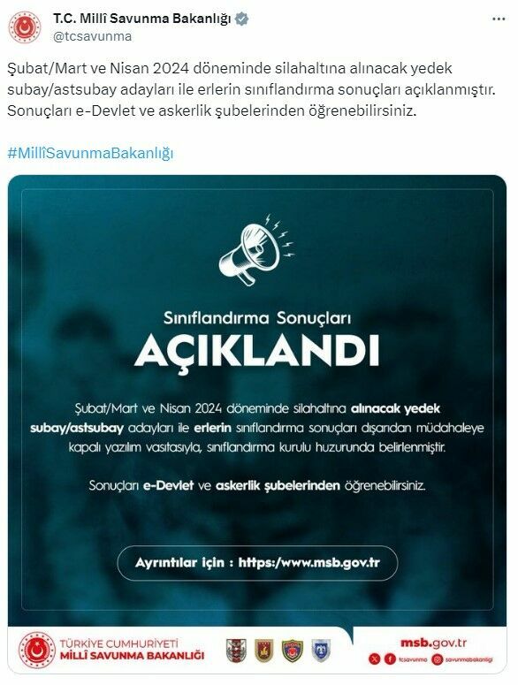 Bakanlık tarafından yapılan duyuruda, "Şubat/Mart ve Nisan 2024 döneminde göreve başlayacak yedek subay/astsubay adayları ile erlerin sınıflandırma sonuçları resmi olarak açıklanmıştır" ifadesine yer verildi.