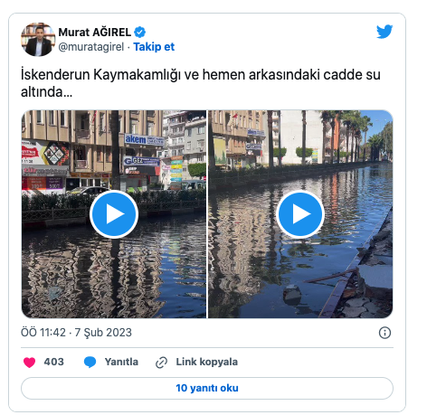 Cumhuriyet yazarı Murat Ağırel alandan anbean görüntüler paylaşarak , "İskenderun Kaymakamlığı ve hemen arkasındaki cadde su altında" dedi.