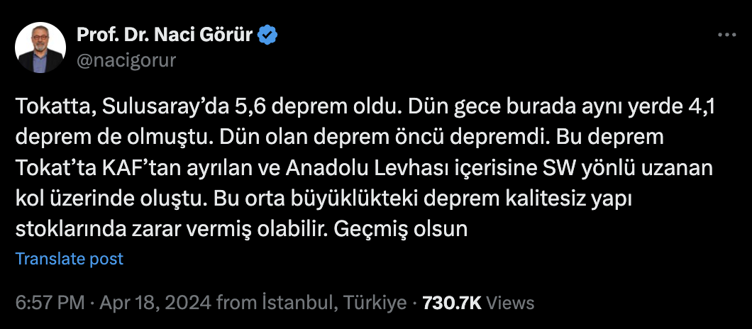 Deprem uzmanı Prof. Dr. Naci Görür, sosyal medya hesabından yaptığı paylaşımda Tokat depremlerini değerlendirdi. Görür, "Tokat'ta, Sulusaray’da 5,6 deprem oldu. Dün gece burada aynı yerde 4,1 deprem de olmuştu. Dün olan deprem öncü depremdi. Bu deprem Tokat’ta KAF’tan ayrılan ve Anadolu Levhası içerisine SW yönlü uzanan kol üzerinde oluştu. Bu orta büyüklükteki deprem kalitesiz yapı stoklarında zarar vermiş olabilir. Geçmiş olsun" dedi.