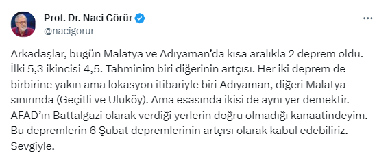 Prof. Dr. Naci Görür, bu sarsıntıların 6 Şubat’taki depremlerin devamı niteliğinde olduğunu ifade etti.