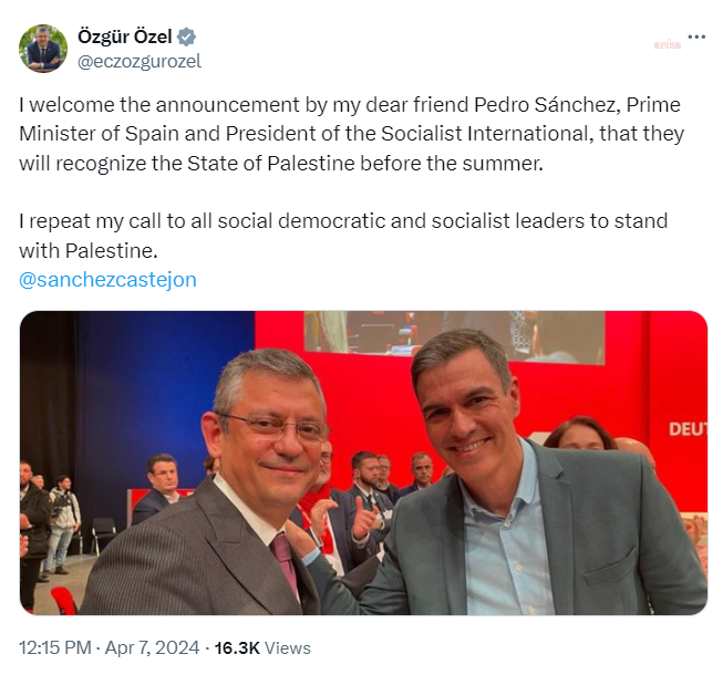 ''İspanya Başbakanı ve Sosyalist Enternasyonal Başkanı değerli dostum Pedro Sanchez'in Filistin Devleti'ni yaz aylarından önce tanıyacakları açıklamasını memnuniyetle karşıladım. Tüm sosyal demokrat liderlere Filistin'i tanıma ve Filistin'in yanında durma çağrımı yineliyorum.''