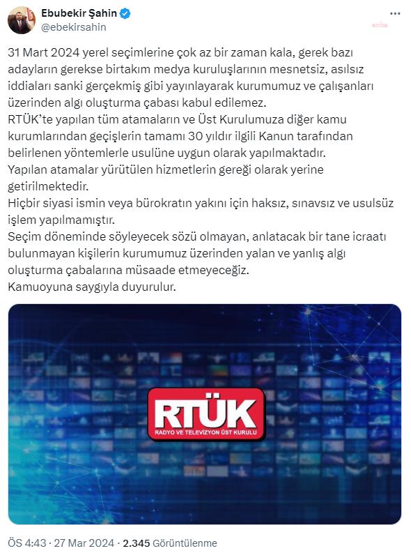 "31 Mart 2024 yerel seçimlerine çok az bir zaman kala, gerek bazı adayların gerekse birtakım medya kuruluşlarının mesnetsiz, asılsız iddiaları sanki gerçekmiş gibi yayınlayarak kurumumuz ve çalışanları üzerinden algı oluşturma çabası kabul edilemez. RTÜK’te yapılan tüm atamaların ve Üst Kurulumuza diğer kamu kurumlarından geçişlerin tamamı 30 yıldır ilgili Kanun tarafından belirlenen yöntemlerle usulüne uygun olarak yapılmaktadır. Yapılan atamalar yürütülen hizmetlerin gereği olarak yerine getirilmektedir. Hiçbir siyasi ismin veya bürokratın yakını için haksız, sınavsız ve usulsüz işlem yapılmamıştır. Seçim döneminde söyleyecek sözü olmayan, anlatacak bir tane icraatı bulunmayan kişilerin kurumumuz üzerinden yalan ve yanlış algı oluşturma çabalarına müsaade etmeyeceğiz."