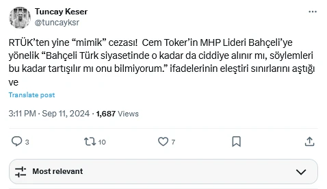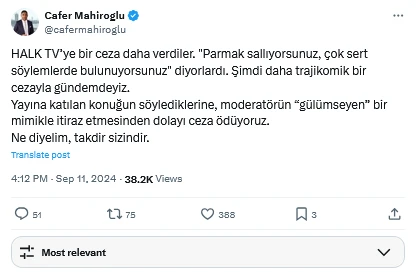 RTÜK üyesi Tuncay Keser, Halk TV’ye verilen cezayı sosyal medya hesabından duyurdu. Keser, kanala verilen cezanın gerekçesini şöyle açıkladı: "Programda Cem Toker’in MHP Genel Başkanı Devlet Bahçeli’ye yönelik eleştirilerinin ardından, sunucu Sinem Fıstıkoğlu’nun gülümsemesi Cem Toker’i destekleyici nitelikte görüldü ve bu nedenle Halk TV’ye yüzde 3 idari para cezası verildi."