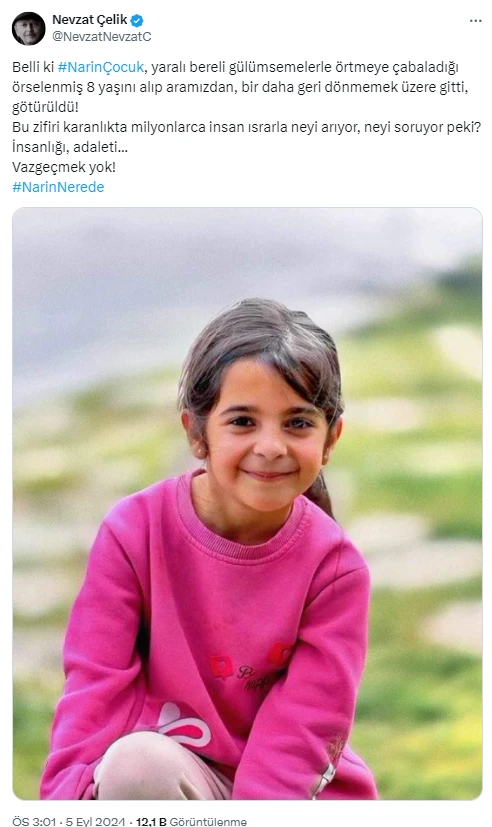 ‘’Belli ki #NarinÇocuk, yaralı bereli gülümsemelerle örtmeye çabaladığı örselenmiş 8 yaşını alıp aramızdan, bir daha geri dönmemek üzere gitti, götürüldü!