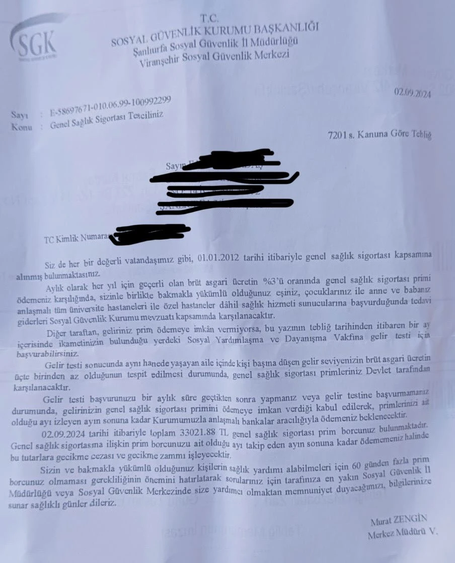 Sosyal Güvenlik Kurumu Başkanlığı Şanlıurfa Sosyal Güvenlik İl Müdürlüğü Viranşehir Sosyal Güvenlik Merkezi, Genel Sağlık Sigortası kapsamında borçlandırılan vatandaşlara haciz öncesi uyarı tebligatları gönderdiği iddia edildi. İddia edilen tebligatlarda, vatandaşlara sağlık sigortası prim borçları hakkında bilgi verilirken, ödemelerle ilgili uyarılarda bulunuldu.