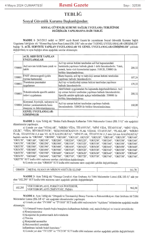 Sosyal Güvenlik Kurumu Sağlık Uygulama Tebliği'ndeki Hizmet Başı İşlem Puan Listesi'nde yapılan değişikliğe ilişkin tebliğ, Resmi Gazete'de yayımlanarak yürürlüğe girdi.