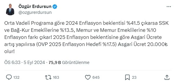 Özgür Erdursun, yıl sonu enflasyonunun yüzde 41,5 olarak gerçekleşmesi durumunda SSK ve BAĞ-KUR emeklileri için yüzde 13,5, memur ve memur emeklileri için yüzde 10 zam öngördü. Erdursun, sosyal medyada yaptığı açıklamada, "2025 Enflasyon Hedefi %17.5 olduğunda Asgari Ücret 20.000 lira olabilir!" şeklinde belirtti.