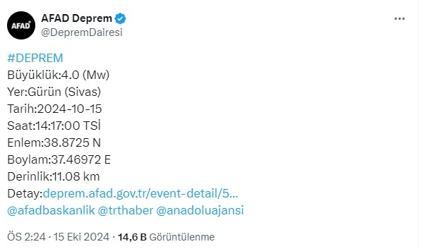 Sivas’ta korkutan deprem! AFAD son depremler 15 Ekim 2024 Salı