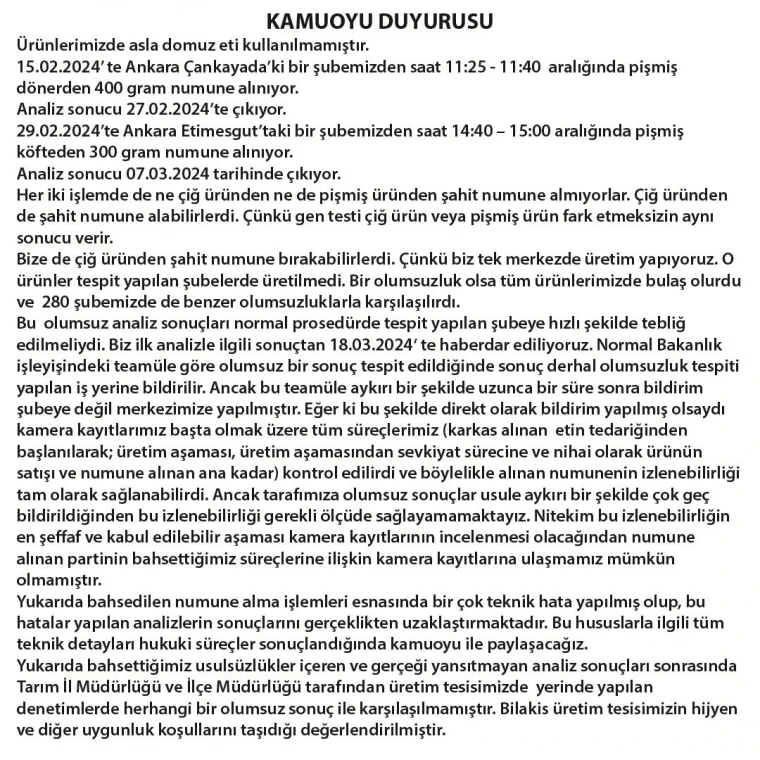 "Ürünlerimizde asla domuz eti kullanılmamıştır. 15.02.2024'te Ankara Çankayada'ki bir şubemizden saat 11:25 - 11:40 aralığında pişmiş dönerden 400 gram numune alınıyor. Analiz sonucu 27.02.2024'te çıkıyor. 29.02.2024'te Ankara Etimesgut'taki bir şubemizden saat 14:40-15:00 aralığında pişmiş köfteden 300 gram numune alınıyor. Analiz sonucu 07.03.2024 tarihinde çıkıyor.