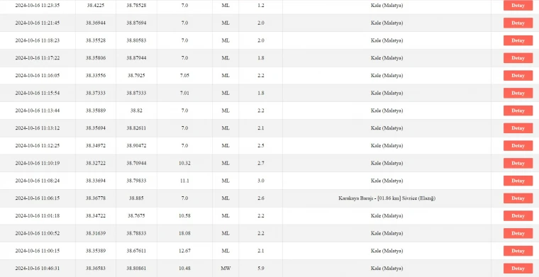 16 Ekim 2024 saat 10.46'da Malatya'nın Kale ilçesinde meydana gelen deprem, çevredeki illerde de geniş bir alanda hissedildi. Deprem Diyarbakır, Elazığ, Şanlıurfa, Kayseri ve Sivas’ta sarsıntılara yol açtı. AFAD, depremin büyüklüğünü 5.9 olarak açıklarken, Kandilli Rasathanesi 6.0 büyüklüğünde olduğunu bildirdi.
