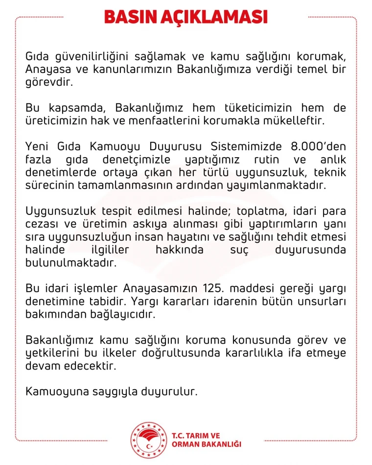 Tarım ve Orman Bakanlığı'nın sosyal medya hesaplarından sert bir açıklama yayınlandı. Bakanlık'tan yapılan açıklamada, "Gıda güvenilirliğini sağlamak ve kamu sağlığını korumak, Anayasa ve kanunlarımızın Bakanlığımıza verdiği temel bir görevdir. Bu kapsamda, Bakanlığımız hem tüketicimizin hem de Üreticimizin hak ve menfaatlerini korumakla mükelleftir. Yeni Gıda Kamuoyu Duyurusu Sistemimizde 8.000'den fazla gıda denetçimizle yaptığımız rutin ve anlık denetimlerde ortaya çıkan her türlü uygunsuzluk, teknik sürecinin tamamlanmasının ardından yayımlanmaktadır. Uygunsuzluk tespit edilmesi halinde; toplatma, idari para cezası ve üretimin askıya alınması gibi yaptırımların yanı sira uygunsuzluğun insan hayatını ve sağlığını tehdit etmesi halinde ilgililer hakkında suç duyurusunda bulunulmaktadır. Bu idari işlemler Anayasamızın 125. maddesi gereği yargı denetimine tabidir. Yargı kararları idarenin bütün unsurları bakımından bağlayıcıdır. Bakanlığımız kamu sağlığını koruma konusunda görev ve yetkilerini bu ilkeler doğrultusunda kararlılıkla ifa etmeye devam edecektir." denildi. Tarım ve Orman Bakanlığı'nın sosyal medya hesaplarından sert bir açıklama yayınlandı. Bakanlık'tan yapılan açıklamada, "Gıda güvenilirliğini sağlamak ve kamu sağlığını korumak, Anayasa ve kanunlarımızın Bakanlığımıza verdiği temel bir görevdir. Bu kapsamda, Bakanlığımız hem tüketicimizin hem de Üreticimizin hak ve menfaatlerini korumakla mükelleftir. Yeni Gıda Kamuoyu Duyurusu Sistemimizde 8.000'den fazla gıda denetçimizle yaptığımız rutin ve anlık denetimlerde ortaya çıkan her türlü uygunsuzluk, teknik sürecinin tamamlanmasının ardından yayımlanmaktadır. Uygunsuzluk tespit edilmesi halinde; toplatma, idari para cezası ve üretimin askıya alınması gibi yaptırımların yanı sıra uygunsuzluğun insan hayatını ve sağlığını tehdit etmesi halinde ilgililer hakkında suç duyurusunda bulunulmaktadır. Bu idari işlemler Anayasamızın 125. maddesi gereği yargı denetimine tabidir. Yargı kararları idarenin bütün unsurları bakımından bağlayıcıdır. Bakanlığımız kamu sağlığını koruma konusunda görev ve yetkilerini bu ilkeler doğrultusunda kararlılıkla ifa etmeye devam edecektir." denildi.