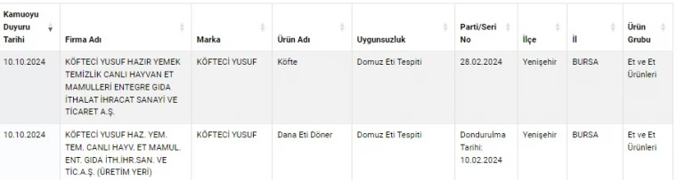Bakanlık tarafından 10 Ekim 2024 tarihinde yapılan açıklamada, Köfteci Yusuf markasına ait iki üründe domuz eti tespit edildiği belirtildi.
