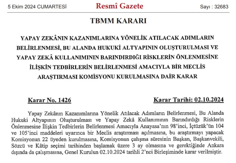 Resmi Gazete'de yayımlanan karar şu şekildedir: “Yapay Zekanın Kazanımlarına Yönelik Atılacak Adımların Belirlenmesi, Bu Alanda Hukuki Altyapının Oluşturulması ve Yapay Zeka Kullanımının Barındırdığı Risklerin Önlenmesine İlişkin Tedbirlerin Belirlenmesi amacıyla Anayasa’nın 98'inci, İçtüzük'ün 104 ve 105'inci maddeleri uyarınca bir Meclis araştırması açılmasına karar verilmiştir."
