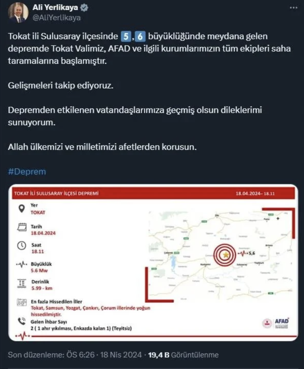 Tokat Sulusaray merkezli meydana gelen 5.6 büyüklüğündeki depremin ardından İçişleri Bakanı Ali Yerlikaya'dan açıklama geldi.
