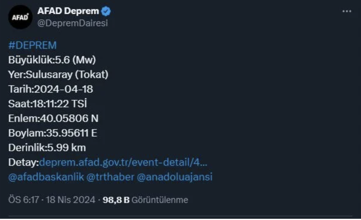 Afet ve Acil Durum Yönetimi Başkanlığı (AFAD) tarafından yapılan açıklamada, depremin merkez üssünün Tokat'ın Sulusaray ilçesi olduğu bildirildi.