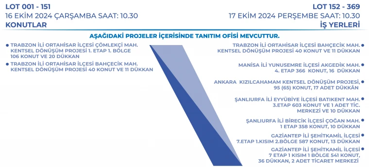 Satışa çıkarılacak konut ve işyerleri, Türkiye genelinde birçok ilde yer alıyor. Adana, Afyonkarahisar, Amasya, Ankara, Antalya, Bursa, Çankırı, Çorum, Erzincan, Eskişehir, Giresun, Gümüşhane, İstanbul, Karaman, Kayseri, Kocaeli, Konya, Nevşehir, Samsun, Şanlıurfa ve daha birçok ilde bu satışlar gerçekleştirilecek.