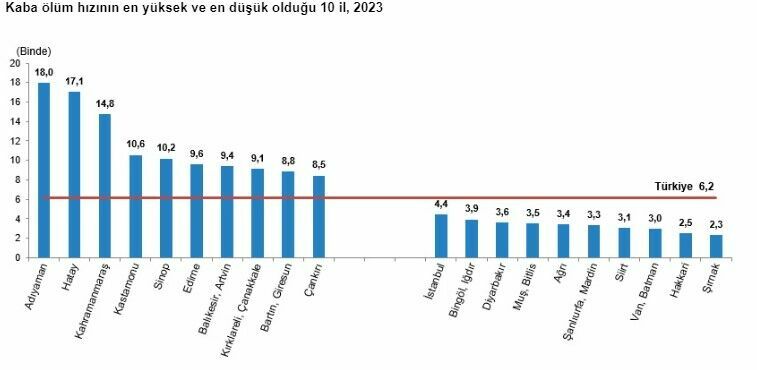 Kaba ölüm hızının en yüksek olduğu il Adıyaman oldu, binde 18,0 ile. Onu sırasıyla binde 17,1 ile Hatay, binde 14,8 ile Kahramanmaraş ve binde 10,6 ile Kastamonu takip etti. En düşük kaba ölüm hızı ise binde 2,3 ile Şırnak ilinde kaydedildi.