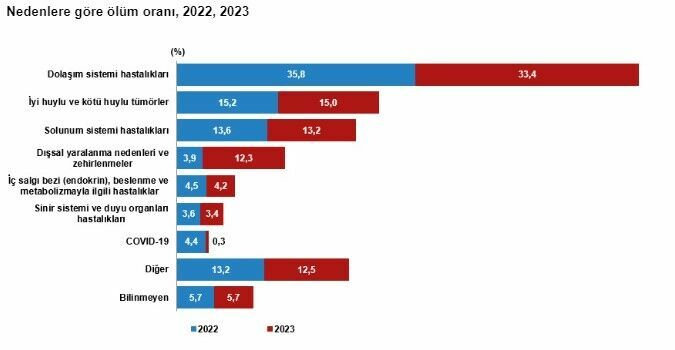 Ölümler nedenlerine göre incelendiğinde, %33,4 ile en fazla ölüm dolaşım sistemi kaynaklı hastalıklardan kaynaklandı. Onu sırasıyla %15,0 ile tümörler ve %13,2 ile solunum sistemi hastalıkları izledi.