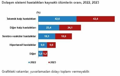 Dolaşım sistemi hastalıklarına bağlı ölümler incelendiğinde, ölümlerin %42,4'ü iskemik kalp hastalıklarından kaynaklandı. Diğer önemli ölüm nedenleri arasında %24,1 ile diğer kalp hastalıkları ve %18,6 ile serebro-vasküler hastalıklar yer aldı.