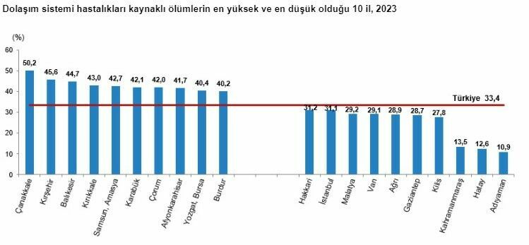 Dolaşım sistemi hastalıklarına bağlı ölümlerin oranının en yüksek olduğu il %50,2 ile Çanakkale oldu. Onu sırasıyla %45,6 ile Kırşehir, %44,7 ile Balıkesir ve %43,0 ile Kırıkkale takip etti. En düşük oran ise %10,9 ile Adıyaman ilinde kaydedildi.