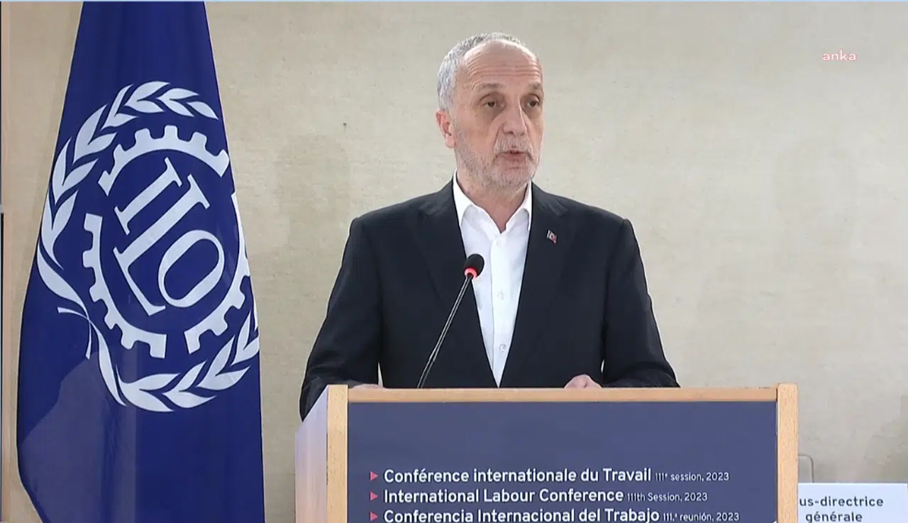 TÜRK-İŞ Genel Başkanı Ergün Atalay, Cenevre’de düzenlenen Uluslararası Çalışma Örgütü’nün 111. ILO Konferansı’nda; “Seçim sonucunda bazı ülkelerin tavırlarına rağmen Cumhurbaşkanı Recep Tayyip Erdoğan vatandaşlarımızın özgür iradesiyle yeniden seçilerek güven tazeledi. Ancak, TBMM’deki dağılıma baktığımızda işveren temsilcilerinin çoğunlukta olduğu bir tabloyla karşılaşıyoruz. Benim ülkem de dahil olmak üzere, çoğu ülkede ücretli kesim nüfusun yüzde 60’ından fazlasına karşılık gelmekte ancak parlamentolarda sadece birkaç kişiyle temsil edilmektedir. Bu şekilde çalışma hayatı sorunlarına kalıcı çözümler üretmek mümkün değildir” diye konuştu.