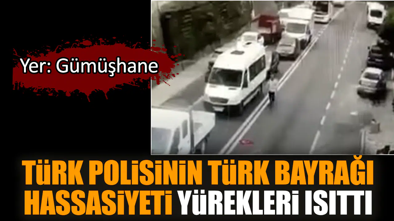 Gümüşhane’de trafik ışıklarında duran bir polis memuru, rüzgarla birlikte yola savrulan Türk bayrağını fark edip hemen aracından çıkarak bayrağı kurtardı.