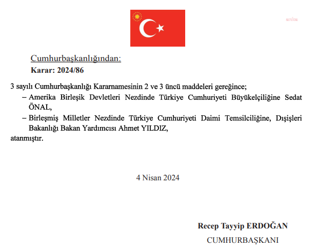 Cumhurbaşkanı Recep Tayyip Erdoğan’ın imzaladığı atama kararları, Resmi Gazete’de yayımlandı. Buna göre; Amerika Birleşik Devletleri Büyükelçiliği'ne Sedat Önal, Gine Büyükelçiliği'ne Rifat Cem Örnekol, Şili Büyükelçiliği'ne Ahmet İhsan Kızıltan, Vietnam Büyükelçiliği'ne Korhan Kemik, Guetamala Büyükelçiliği'ne Beliz Celasin Rende, Bulgaristan Büyükelçiliği'ne Sait Uyanık, Kosta Rika Büyükelçiliği'ne Naciye Gökçen Kaya, Sri Lanka Büyükelçiliği'ne Semih Lütfü Turgut ve Ekvator Ginesi Büyükelçiliği'ne Ahmet Ergin atandı. Ayrıca Birleşmiş Milletler Türkiye Cumhuriyeti Daimi Temsilciliği'ne Dışişleri Bakan Yardımcısı Ahmet Yıldız getirildi.