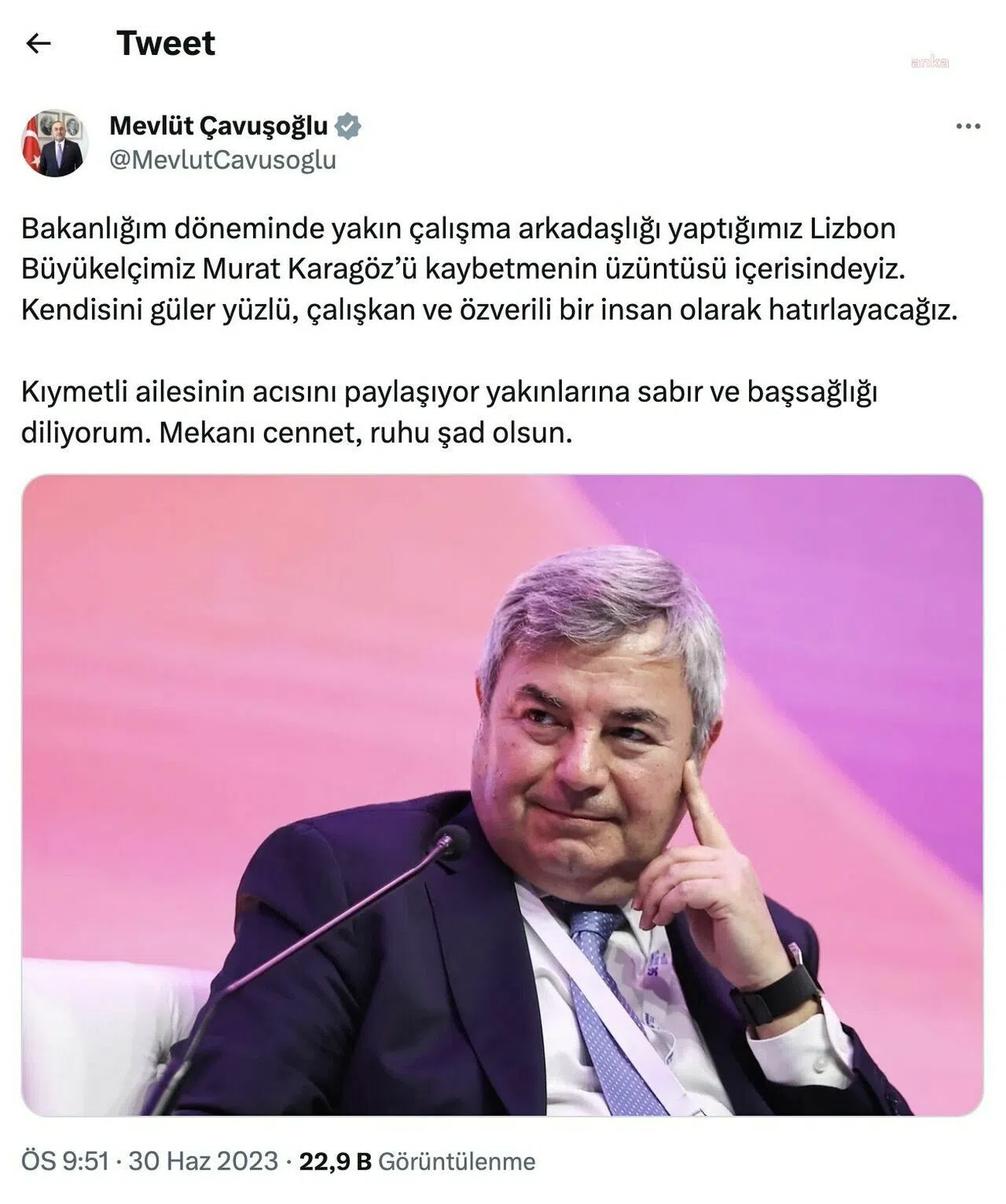 “Bakanlığım döneminde yakın çalışma arkadaşlığı yaptığımız Lizbon Büyükelçimiz Murat Karagöz’ü kaybetmenin üzüntüsü içerisindeyiz. Kendisini güler yüzlü, çalışkan ve özverili bir insan olarak hatırlayacağız. Kıymetli ailesinin acısını paylaşıyor yakınlarına sabır ve başsağlığı diliyorum. Mekanı cennet, ruhu şad olsun.”