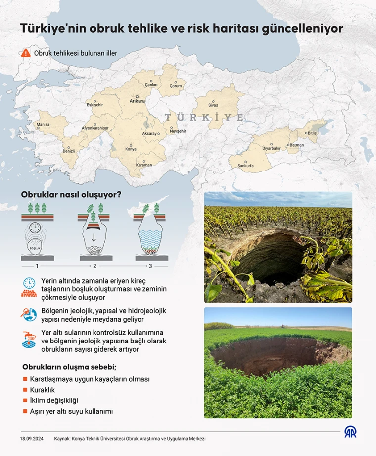 Prof. Dr. Arık, Türkiye'nin karstlaşmaya uygun kayaçlarla kaplı olduğunu ifade etti. Konya Kapalı Havzası’ndaki Konya, Karaman, Aksaray ve Niğde illerinde obrukların tarihsel olarak var olduğunu hatırlatan Arık, Anadolu'nun diğer bölgelerinde de benzer oluşumların arttığını vurguladı.