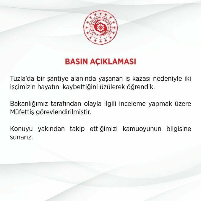 Çalışma ve Sosyal Güvenlik Bakanlığı, yaşanan üzücü iş kazası hakkında yazılı bir açıklama yaptı. Açıklamada, Tuzla’daki şantiyede meydana gelen göçükte iki işçinin hayatını kaybettiği belirtilerek, "Bakanlığımız tarafından olayla ilgili inceleme yapmak üzere müfettiş görevlendirilmiştir. Konuyu yakından takip ettiğimizi kamuoyunun bilgisine sunarız" ifadelerine yer verildi.