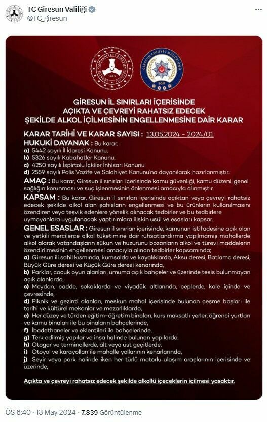Giresun Valiliği, kamu güvenliği ve genel sağlığın korunması amacıyla şehirde açık alanda alkol tüketimini yasaklayan bir karar aldı. Bu karar, sosyal medya hesabı aracılığıyla duyuruldu ve şu şekilde detaylandırıldı: