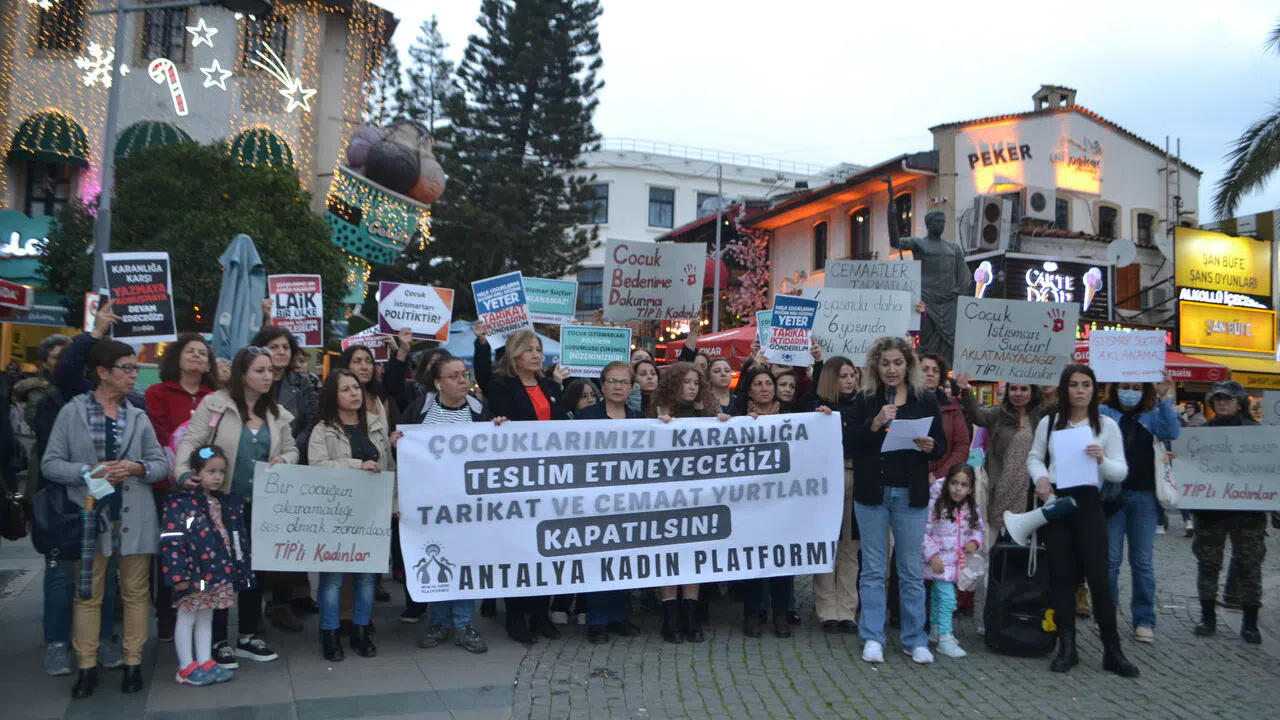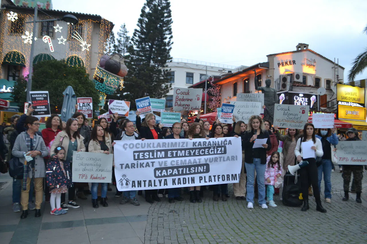 Ayfer Güneşhan, “AKP/ MHP İktidarı tarafından tarikatların baskısıyla iptal edilen İstanbul sözleşmesinin neden iptal edildiğini yaşanan bu istismar göstermektedir. Kadınların çocukların LGBTİ+ bireylerin yaşam güvencesi için İstanbul sözleşmesinin ne kadar önemli olduğu bu olaylarla da birkez daha ortaya çıkmıştır. Eğer bu iktidar değişmezse biliyoruz ki bu soruşturmaların sonucunda sorumlular ceza almayacak ve soruşturma olarak kalacaktır.Kadın bakanlığı yerine adı değiştirilerek Aile ve sosyal politikalar bakanlığı olan bakanlık sessiz kalarak bu suça ortak olmaktadır. Antalya kadın platformu olarak gerçek sorumluların cezalandırılmasını , Aile ve sosyal politikalar bakanını istifaya çağırıyoruz. olsun ki tarikatları, cemaatleri, bunların para kaynaklarını, devletteki dayanaklarını, siyasi destekçilerini söküp atacağız. Din tüccarlarının elinde cehennemi yaşayan o çocukları kurtaracağız. Bu suça ortak olanlara sesleniyoruz! Bundan sonra size korkusuz tek bir gece yok. Çünkü hepiniz teker teker yargılanana kadar bize de tek bir gece rahat uyku yok! Yere batsın istismarcı, tecavüzcü, çocuk ve kadın düşmanı düzeniniz. Sonsuza kadar süreceğini sandığınız bu düzeni başınıza yıkacağız! İşlediğiniz tüm suçların cezasını çekeceksiniz! Tarikat ve cemaat yurtları kapatılması için mücadele edeceğiz. Özgürce, eşitçe, laiklikten asla taviz vermeyen bir ülkeyi emekçi halkımızla birlikte kuracağız! Haberi yapan ve hepimizin duymasını sağlayan gazeteci Timur Soykan ve Murat Ağırele de hepimizin adına teşekkür ediyoruz. Timur Soykan ve Murat Ağırel yalnız değildir” diyerek açıklamasını sonlandırdı.