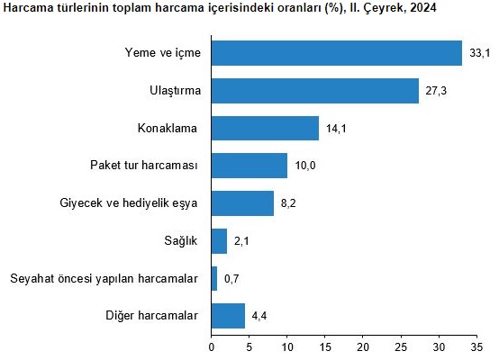 Harcamaların dağılımına bakıldığında, en yüksek payı yüzde 33,1 ile yeme ve içme harcamaları aldı. Bunu yüzde 27,3 ile ulaştırma harcamaları ve yüzde 14,1 ile konaklama harcamaları takip etti. Harcama türlerinde geçen yıla göre önemli artışlar gözlemlendi: yeme ve içme harcamaları yüzde 117,1, ulaştırma harcamaları yüzde 123, konaklama harcamaları ise yüzde 112,2 oranında arttı.