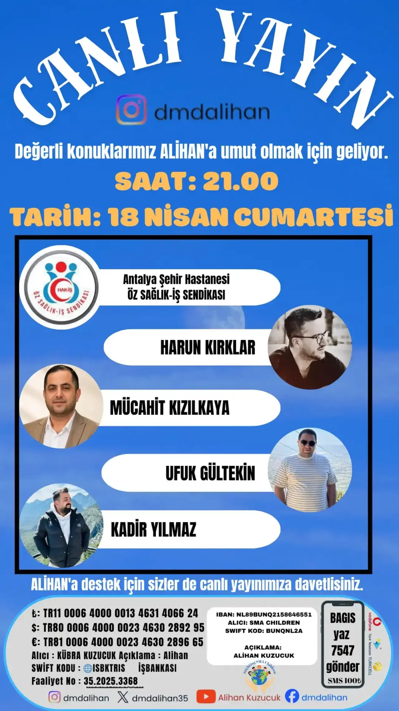 Kampanya kapsamında Alihan’ın tedavi sürecine katkı sağlamak isteyen vatandaşlar için bağış bilgileri paylaşıldı. SMS ile destek vermek isteyenler ise “BAĞIŞ” yazıp 7547’ye göndererek kampanyaya katkıda bulunabilecek.
