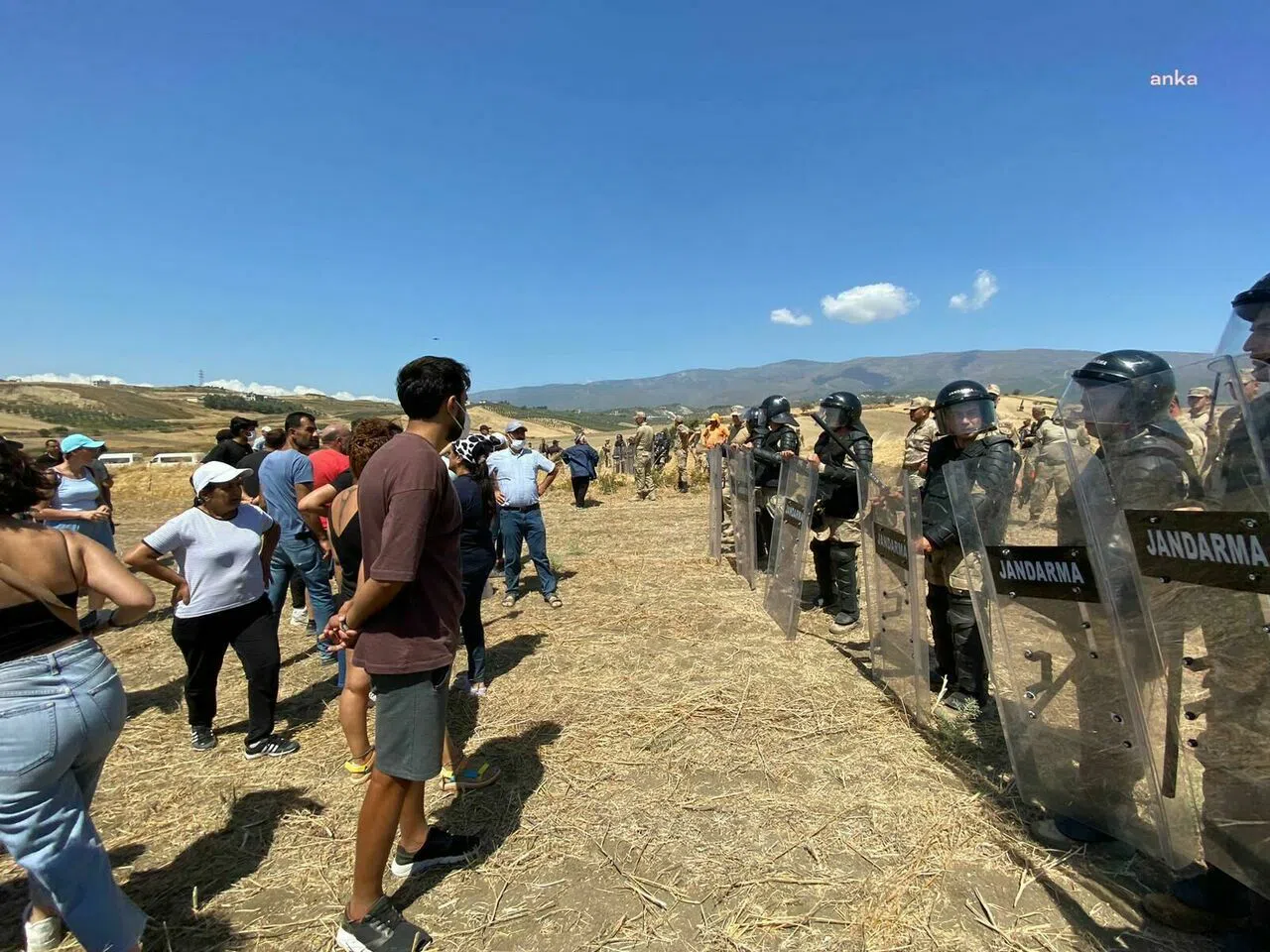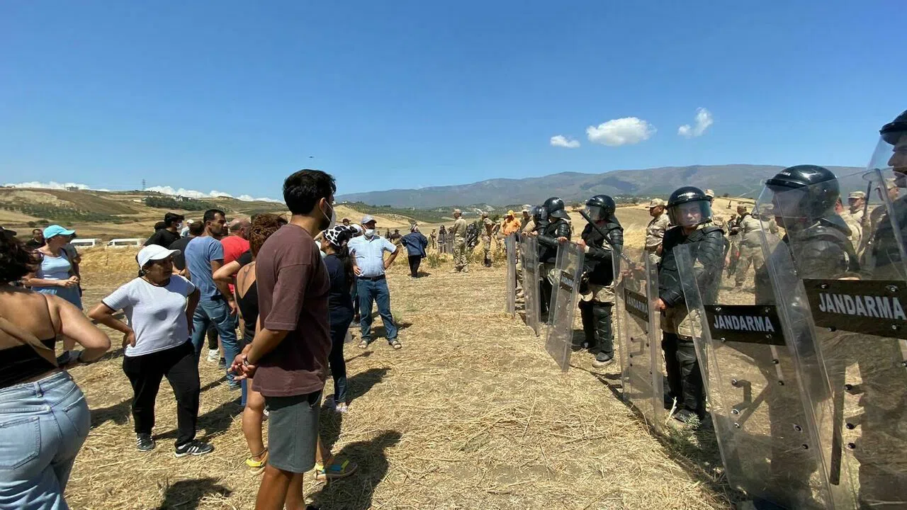 Arazide toplanan köylüler, Arapça “Ma Rıhna, Nıhna Hon” (Biz Gitmedik, buradayız)” ve “Havama, suyuma toprağıma dokunma”, “Sermaye defol bu memleket bizim” sloganları attı. Kadınlar tarım arazilerine oturarak alkışlarla “yuh yuh soyanlara” türküsünü söyledi.