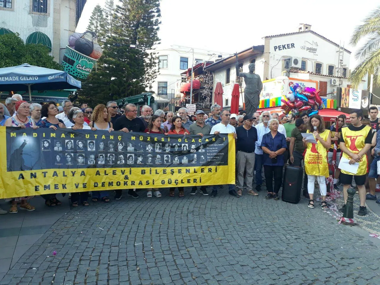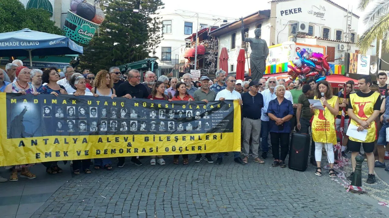 Attalos Meydanı’nda yapılan açıklamaya başta alevi dernekleri olmak üzere, siyasi parti temsilcileri, sendika yöneticileri ve halk katıldı. Pir Sultan Abdal Kültür Derneği Antalya Şube Yönetim Kurulu Üyesi Zeynep Şahin “2 Temmuz 1993 Cuma günü, Madımak Oteli’nde yaşatılan katliamın üzerinden 30 yıl geçti. 4. Pir Sultan Abdal’ı anma etkinliklerinde gerici, ırkçı, faşistler tarafından, 33 aydınımız, ozanımız, sanatçımız, semah dönen gençlerimiz, kısacası AYDINLIK GELECEĞİMİZ Madımak Oteli ateşe verilerek katledilmiştir. Katliamın üzerinden 30 yıl geçmesine rağmen, katliamın hesabı verilmemiş, arkasındaki gerçek sorumlular açığa çıkarılmamış, Adalet yerini bulmamıştır. Katillerin çoğu affedilmiş, yurt dışına çıkarılmış, normal yaşamlarına devam etmiştir. Tutuklu olanlar serbest bırakılmıştır. 30 Yıllık hukuk mücadelesinde adeta aileler, Alevi örgütleri ve vicdanlar yargılanmıştır. Cafer Erçakmak ve 7 kişinin yargılandığı davanın zaman aşımı kararı, dönemin Başbakanı Recep Tayyip Erdoğan tarafından ‘Milletimize hayırlı olsun’ diyerek karşılanmıştır. Firari 3 sanık yönünden, devam eden mahkeme süreci de zaman aşımına uğratılmaya çalışılmaktadır. Herkes bilmelidir ki, Sivas Madımak Katliamı insanlığa karşı işlenmiş bir suçtur. İnsanlığa karşı işlenen suçlarda zaman aşımı olamaz” dedi.