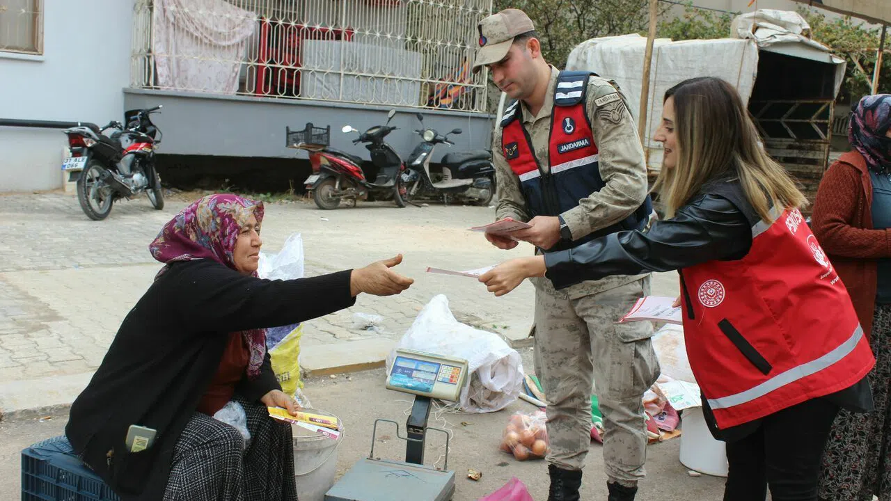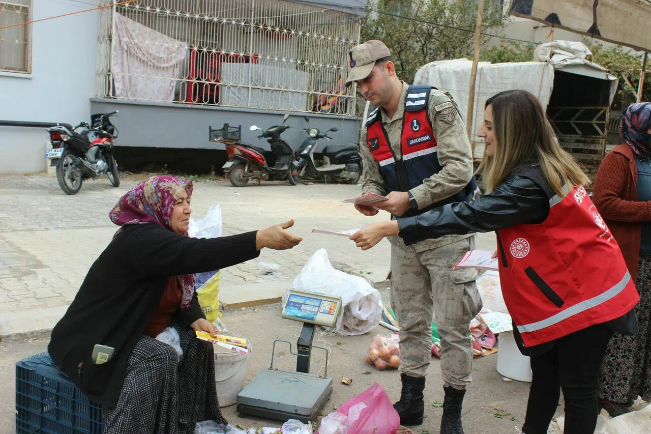 Pazarda bir araya gelen polis ve jandarma ekipleri, kadına yönelik şiddetle mücadelede farkındalığı artırmak amacıyla broşür dağıttı.