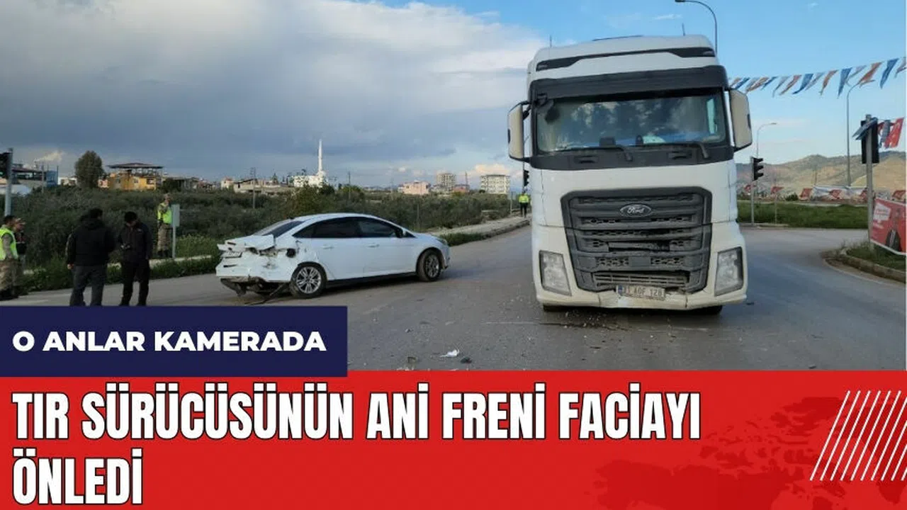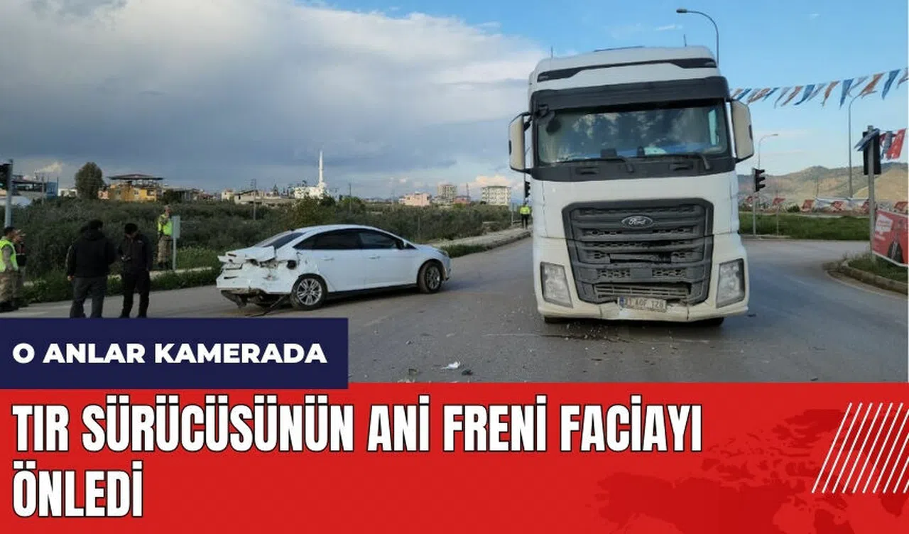 Hatay’ın Hassa ilçesinde meydana gelen trafik kazasında bir tır ile otomobilin çarpışması sonucu 2 kişi yaralandı. Kaza anı, güvenlik kamerasına yansırken, tır sürücüsünün ani frenle faciayı önlediği görüntülendi.